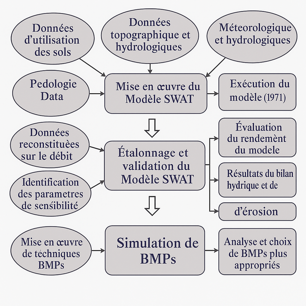 • Modélisation hydro-sédimentaire : Utilisation du modèle SWAT et de l’équation universelle modifiée de perte en sol (MUSLE) pour prédire l’écoulement et le transport des sédiments.